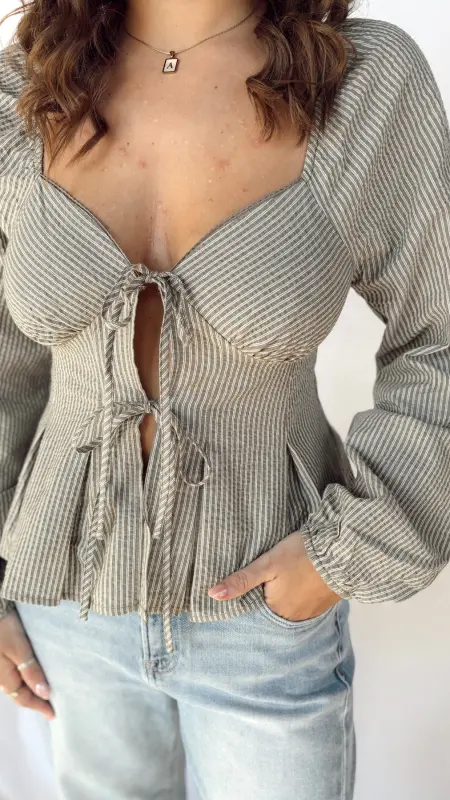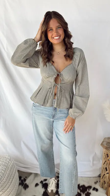 The Archie Top brings effortless style with its classic grey pinstripe pattern and playful tie details. This long sleeve essential works perfectly for layering or wearing solo, giving you that polished-yet-relaxed vibe.