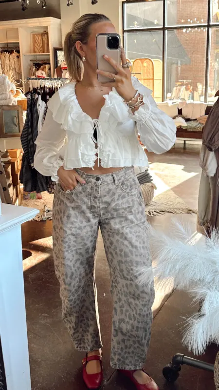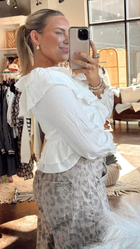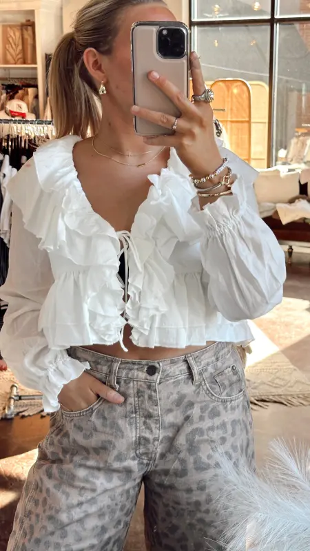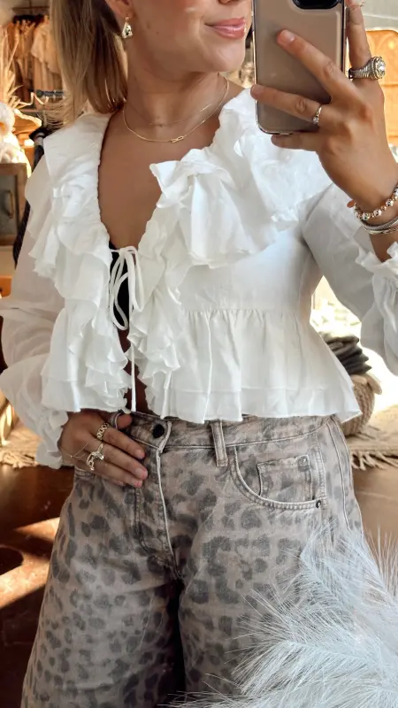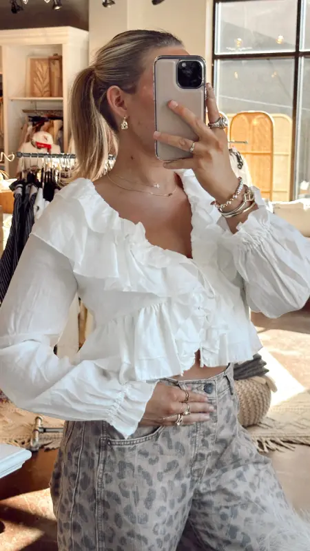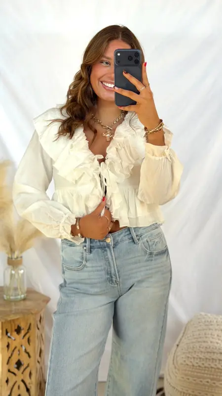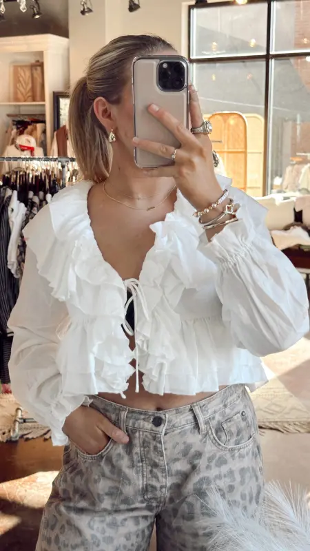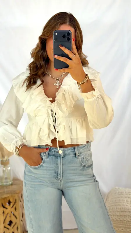 The Cara Top is your go-to piece for effortless style. This cropped white top features a flattering v-neck, long sleeves, and charming ruffle detailing that adds movement and texture. The tie detail at the front creates a playful, adjustable fit that lets you customize your look. Perfect for pairing with high-waisted jeans or skirts for a chic, put-together vibe.