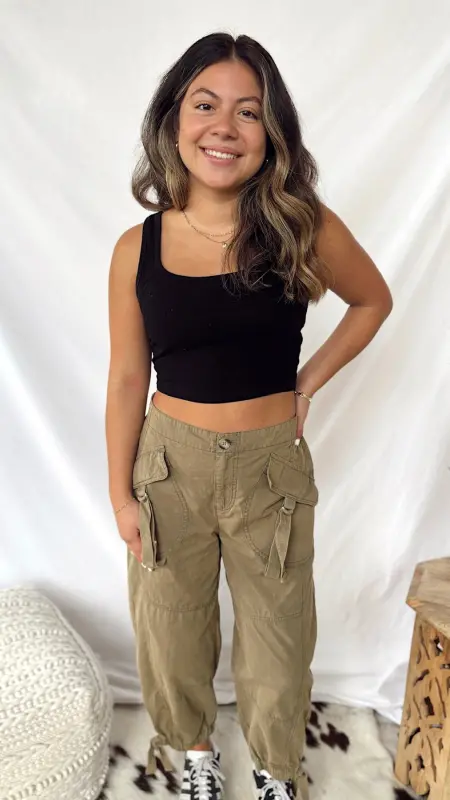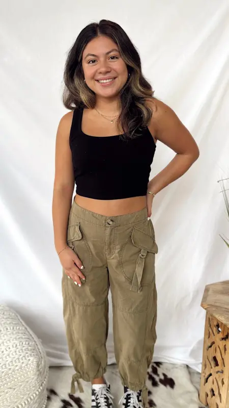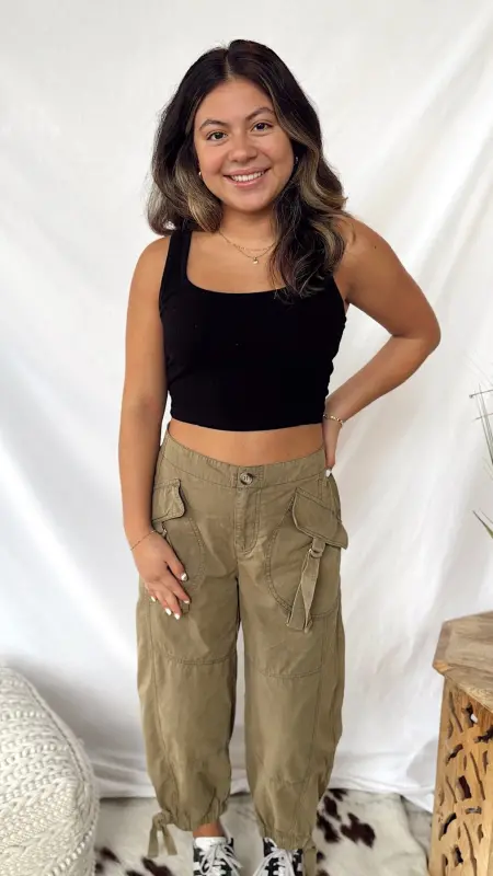 These Olive Tree Cargo Pants bring a playful twist to your casual look with their fun olive green shade and trendy cropped cut. Designed with handy side pockets, they blend style and practicality effortlessly.