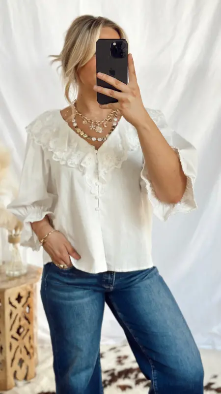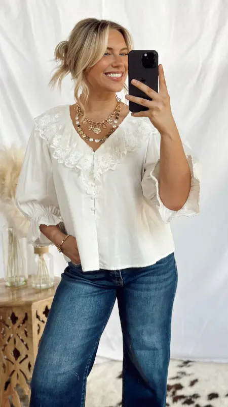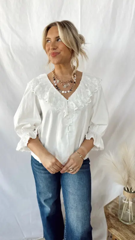 The Pamela Top is a crisp white blouse that brings effortless elegance to any wardrobe. Featuring a flattering V-cut neckline adorned with delicate lace detailing, this piece strikes the perfect balance between classic and contemporary.