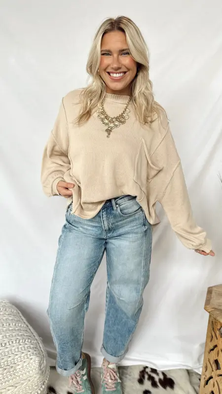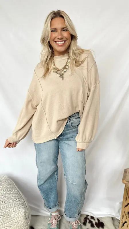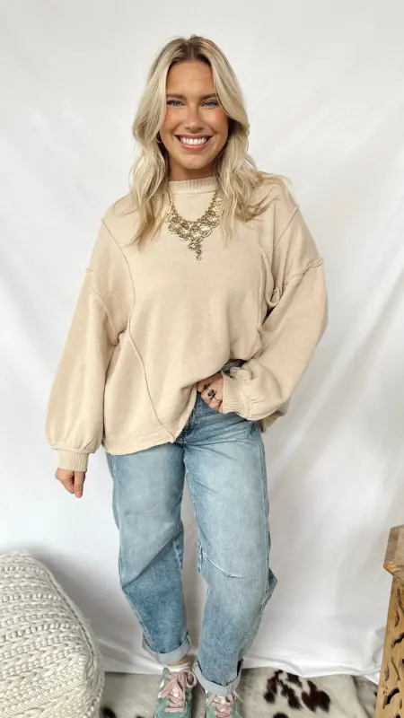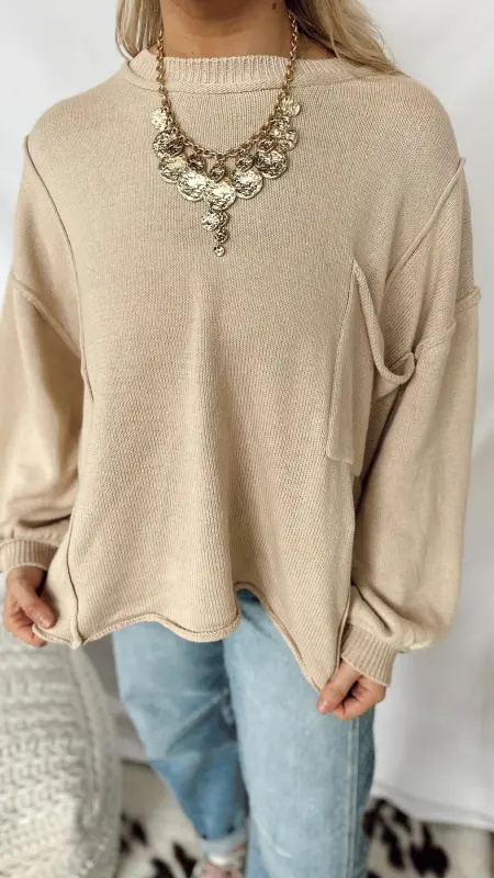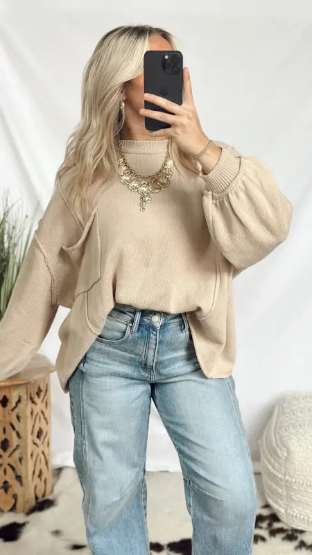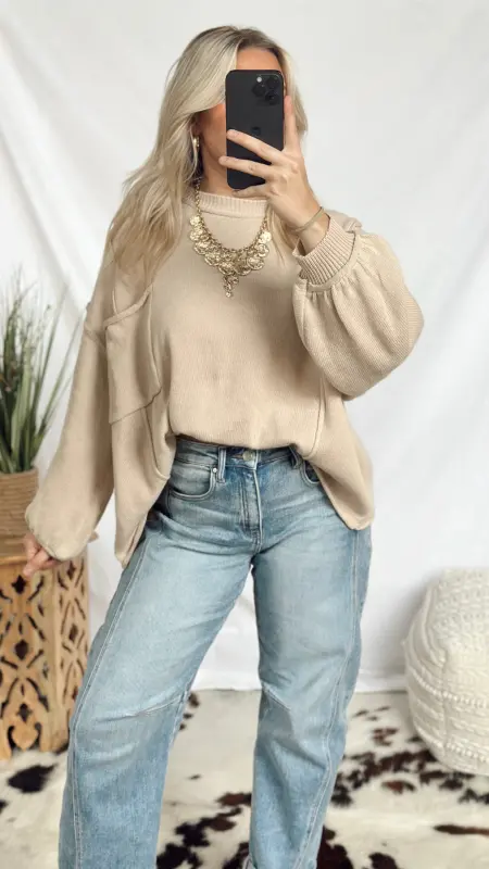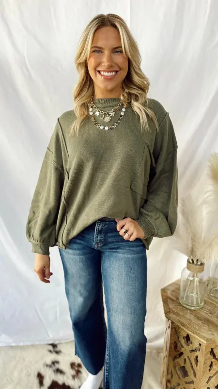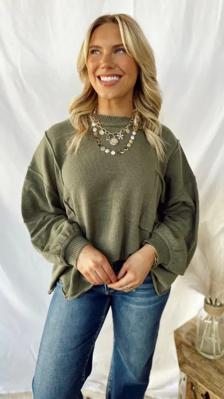The Riverwalk Sweater brings playful charm with its balloon sleeves and cozy fit. Available in olive green and taupe, it adds a fun pop of color to your casual wardrobe while keeping you comfortable all day long.